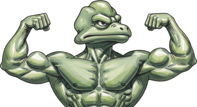 Muscular frog flexing its muscles in cartoon illustration isolated on transparent background