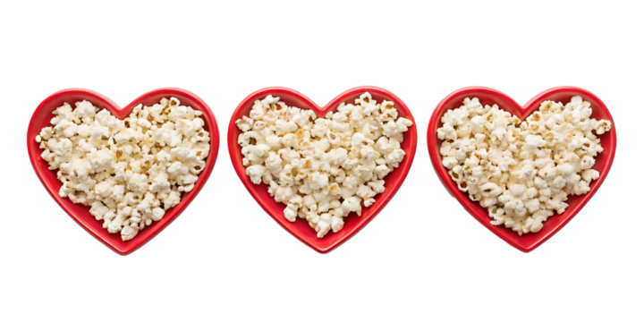 Fresh Popcorn in Red Heart-Shaped Bowl in Three Distinct Styles for Snacks, PNG Transparent