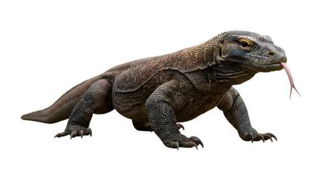 Komodo dragon flicking its forked tongue, isolated on transparent background