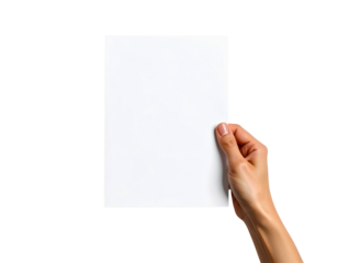 Hand holding blank white sheet of paper isolated on white background