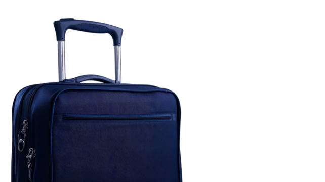 a blue duffel bag with white stripes