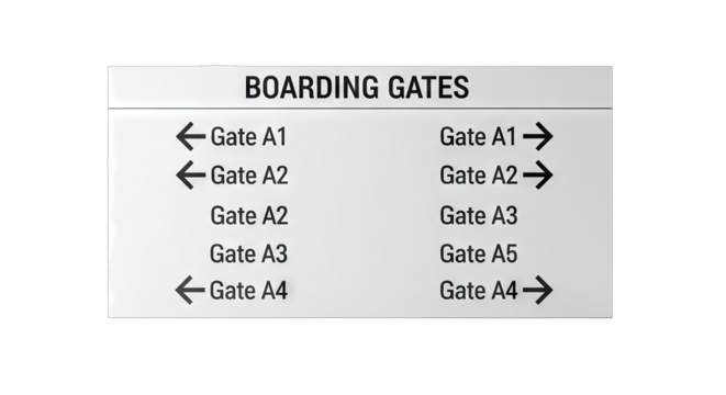 Airport Boarding Gates Signage with Arrows and Gate Numbers for Passenger Navigation.