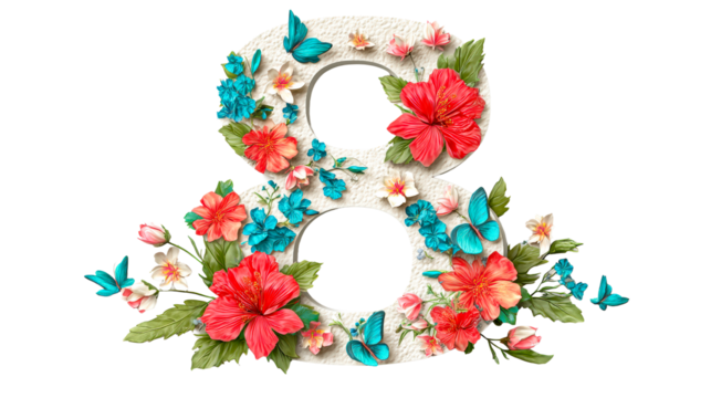 Number 8 decorated with vibrant hibiscus flowers and tropical butterflies, cut out transparent