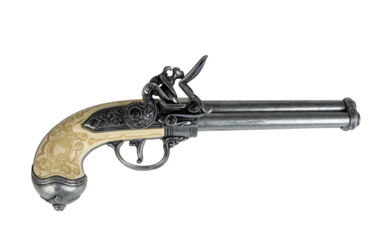 Ornate antique flintlock pistol, pirate gun weapon isolated on a white background, cutout file. Ideal for historical designs, vintage themes, and digital art.