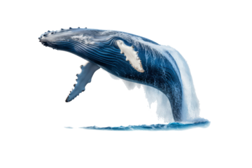 A whale jumps from the water, splashing water. Suitable for marine conservation, marine life education, holiday promotions, and wildlife documentaries