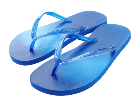 Pair of blue cartoon flip-flops smiling, portraying happiness, fun, and relaxing summer beach footwear on transparent background