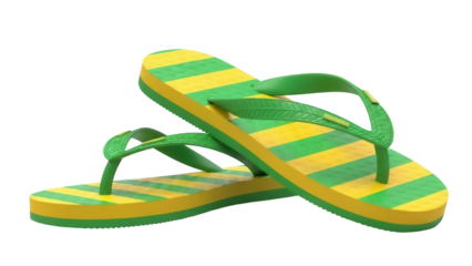 Striped green and yellow flip flops PNG isolated on transparent background, summer footwear for beach and vacation