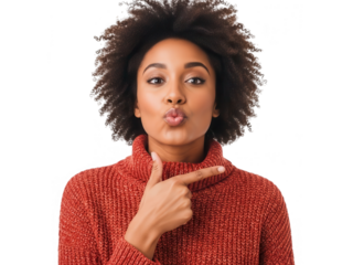 Woman with afro hair making a kissing gesture and pointing forward playfully