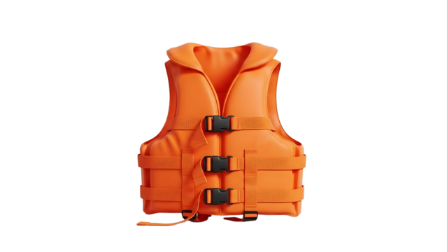 Close-up of a bright orange personal flotation device with black straps and buckles