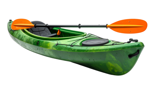 A vibrant green kayak with a black seat and orange paddle against a stark black background