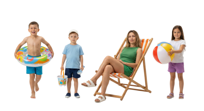 Children Enjoying Summer Activities with a Relaxed Woman in a Deck Chair Isolated on a Black