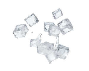 Crystal clear ice cubes floating against a white backdrop isolated on a transparent background. Generative AI