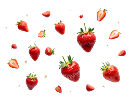 whole strawberries and floating strawberry pieces,leaf,isolated,ripe