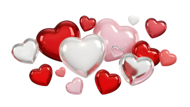 Floating hearts with glossy shine on transparent backdrop