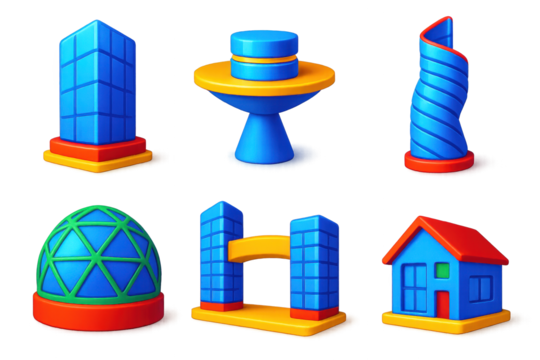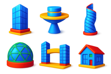Futuristic Architecture Icons. 3D icon set of futuristic architecture: glass tower, floating platform, geodesic dome, spiral