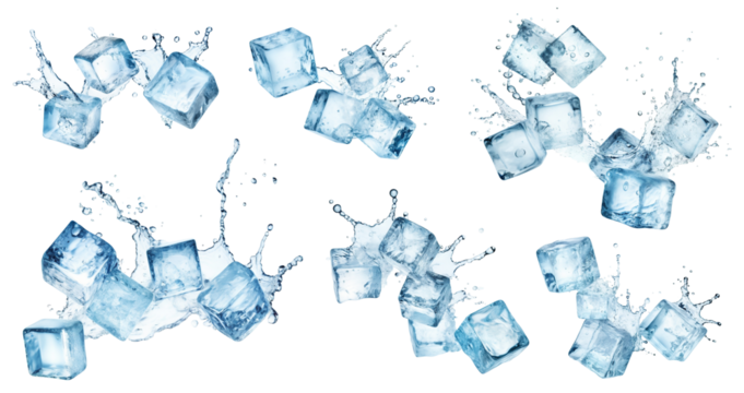 Ice Cubes explosion flying, crystal clear ice wave floating, fall down in air. Ice Brick block cube is frozen water healthy thirsty. White background Isolated high speed shutter, freeze stop motion