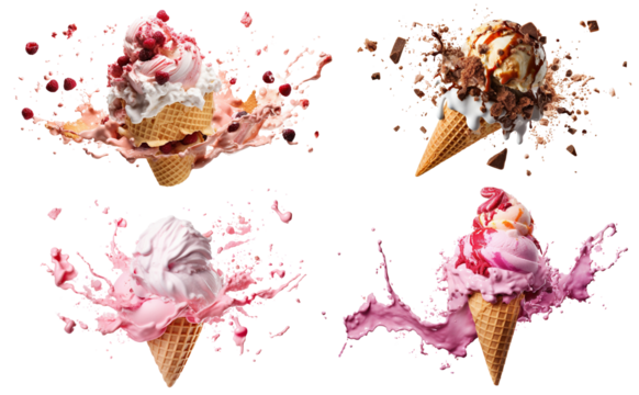 Delicious ice cream cone trio with sprinkles and almonds on transparent background
