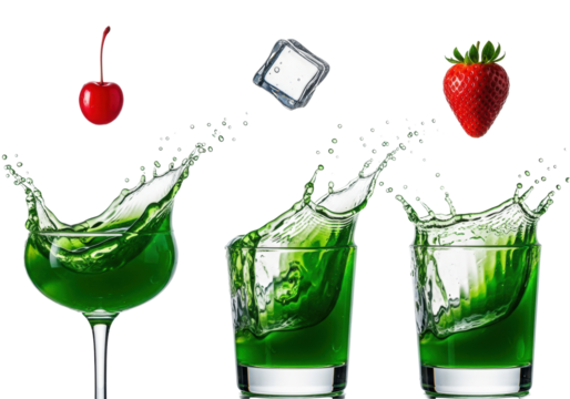 three cocktail glasses with viscous emerald green liquid violently splashing upwards, frozen motion macro shot with floating cherry, ice, and strawberry on a white background. concept for beverage