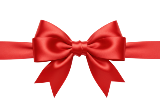 Pristine vibrant red satin ribbon tied into a neat symmetrical bow with crisp loops, elegant trails, on a transparent background with copy space, clean studio lighting, concept for luxury gifting and