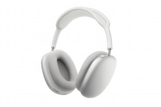 Modern silver wireless headphones floating on a transparent background, perfect for music lovers and audiophiles