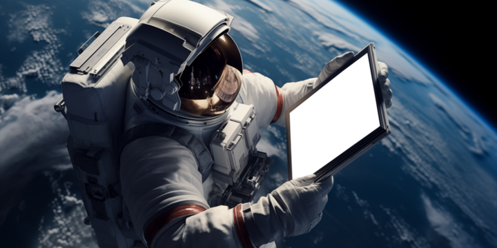Astronaut checking infromations on digital  tablet in outer space