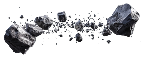 Group of floating asteroids, cut out. Isolated on a transparent background.