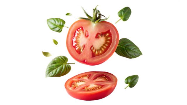 Flying tomatoes parsley and basil leaves isolated on a transparent background