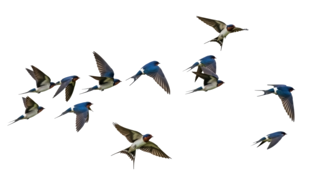 Isolated flock of birds, European barn swallows fly together in daylight, beautiful avian