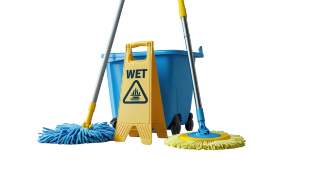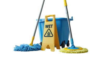 A close-up view of a cleaning kit, including a blue mop, a yellow wet floor sign, and a blue cleaning bucket.