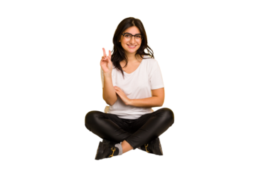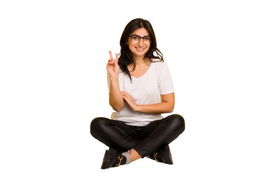 Smiling woman in athletic wear sitting cross-legged on transparent background