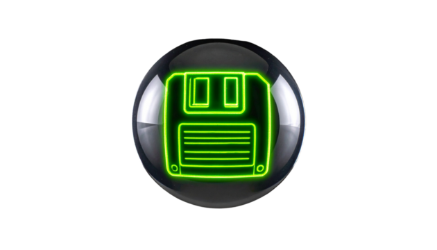 A glowing green floppy disk icon inside a reflective, dark sphere