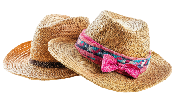 Straw hats with decorative elements summer and casual style isolated on transparent background.