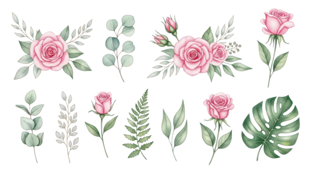 Set watercolor elements of pink roses; collection garden flowers; leaves; branches Botanic Wedding floral design Collection of greenery leaf plant forest herbs tropical leaves
