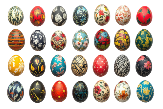Twenty glossy, intricately patterned Easter eggs in bright, saturated colors like yellow, green, pink, blue, purple, orange, and red, arranged in a grid on transparent, studio product shot. Joyful