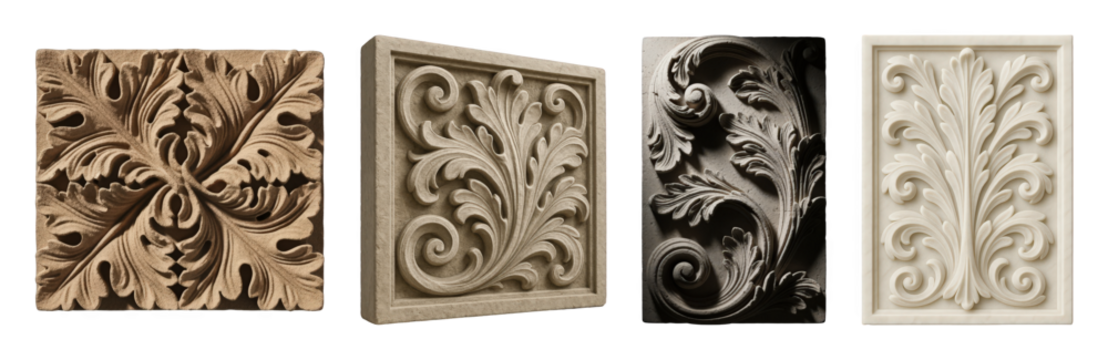 Decorative carved panel set including acanthus leaf, scroll, and floral motifs in stone textures isolated. Classical architectural elements for design.