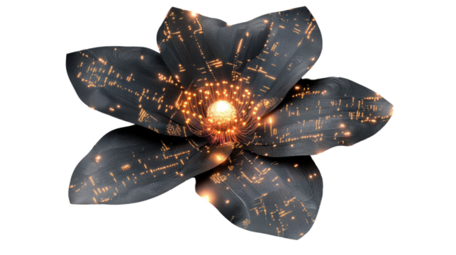 Glowing futuristic flower blooming with electronic circuits on transparent background