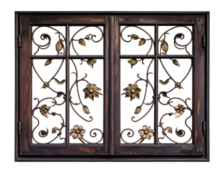 Rustic Iron Window Grill with Elegant Floral Scrollwork Design, isolated on a transparent background, PNG