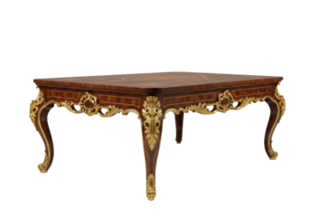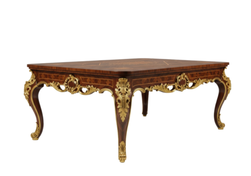 ornate rococo dining table, polished dark mahogany, intricate floral marquetry top, massive gilded cabriole legs, isolated on a transparent studio background. Concept of handcrafted luxury