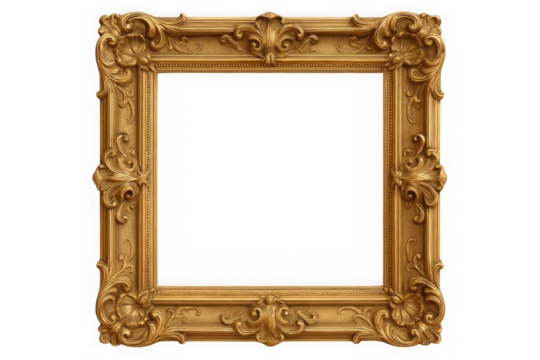 Ornate golden baroque picture frame with intricate scrollwork and floral accents isolated on transparent background