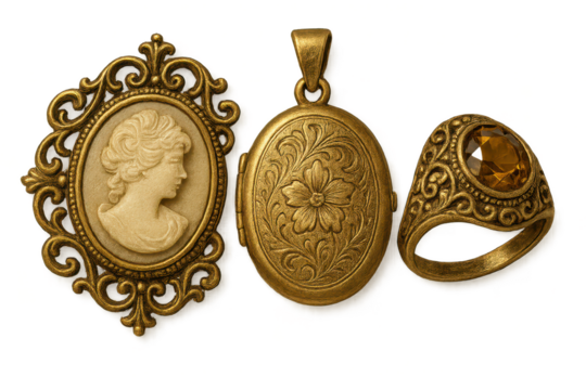 Vintage brass clasp displaying ornate floral and scrollwork patterns, highlighting intricate metalwork details against transparent surface