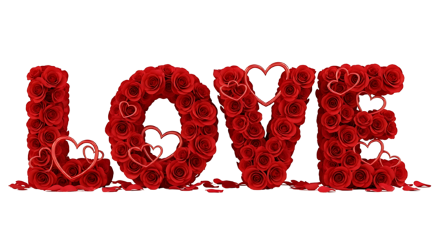 Romantic word love crafted from vibrant red rose petals and delicate heart shapes isolated on transparent background