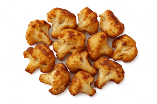 Roasted seasoned cauliflower florets arranged on a transparent background