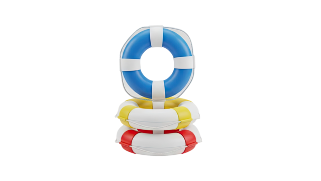 3D Stack of colorful life buoys with ropes on transparent background