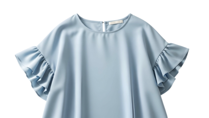 Light blue, flowy top with ruffled sleeves, small back keyhole, simple style