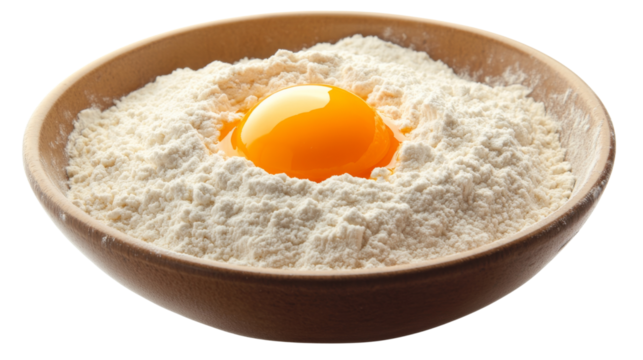Top view of flour with one yolk in the center , isolated on transparent background, png