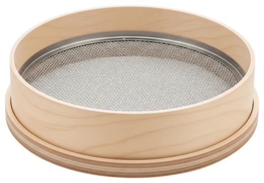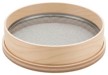 Round wooden kitchen flour sifter sieve with fine metal mesh on a transparent background
