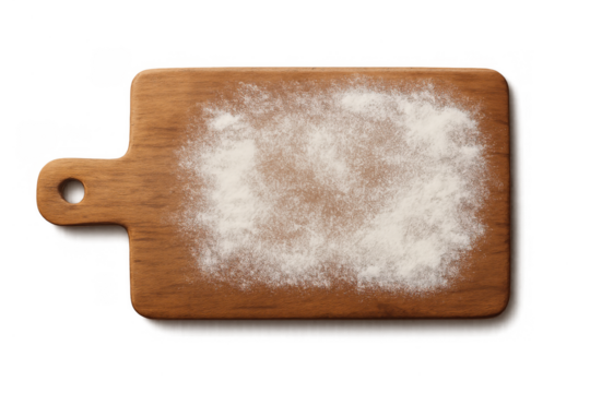 Wooden cutting board with flour texture, preparing dough for baking, cooking, transparent background