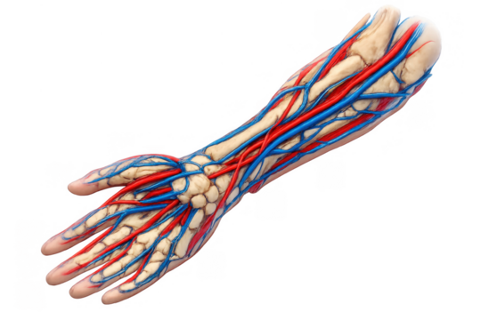 Human arm anatomy showing bones, arteries, and veins on a transparent background for medical science education
