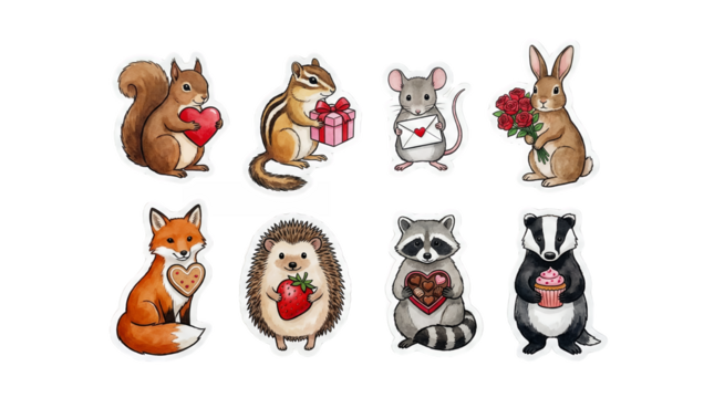 Cute floral cat character wearing glasses denim jacket and scarf holding pastel flower bouquet in artistic style isolated on white background
