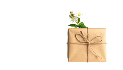 Brown paper gift tied with twine, adorned with white flowers and foliage